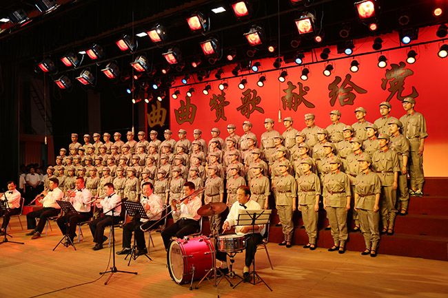最后,集团公司工会副主席贾志成上台指挥,台上队员和台下2000多名观众全体起立,共同唱响《没有共产党就没有新中国》,现场红旗舞动,歌声洪亮,将整台演出活动推向了高潮。
