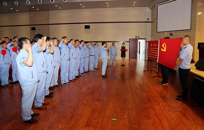 8时25分,大会在庄严的国歌声中开幕。随后,8名新党员面对鲜红的党旗,在公司党委副书记王宏伟的带领下,举起右手,庄严宣誓,光荣地加入党组织的行列;现场全体党员随着新党员一起重温了入党誓词。