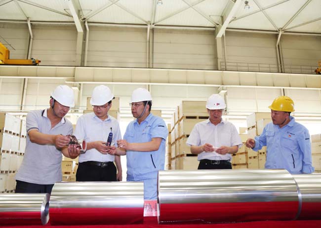 6月1日,洛阳国机重工有限公司张国龙等一行到我公司参观访谈,集团公司董事长李跃民陪同。图为在万基铝加工公司参观铝箔生产线。
