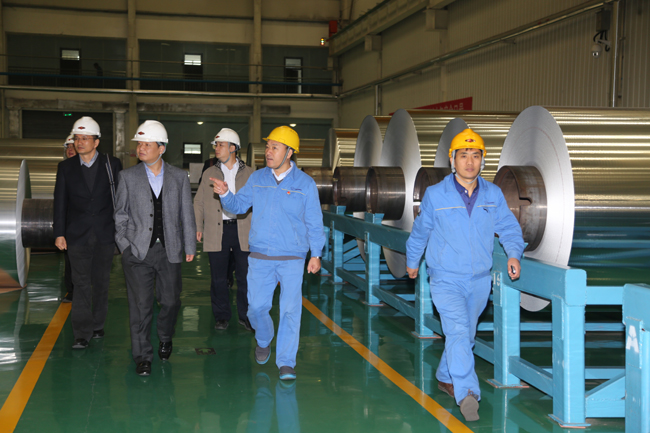 中原银行洛阳分行行长邵强、副行长唐松立、徐元新一行到公司考察,董事长李跃民、副总经理王尚友陪同。图为邵强一行在座谈中,并到我公司大板锭、石墨化阴极、高精度铝板带箔生产线进行考察。