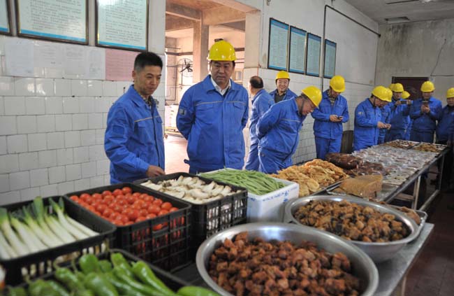 在发电公司餐厅察看饭菜品种。