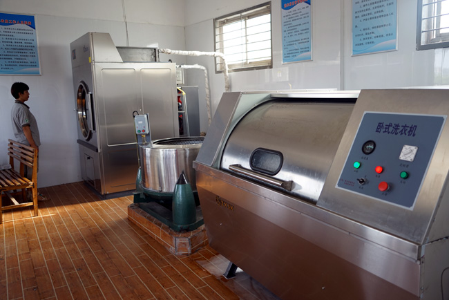 生产一线员工工作服脏得较快,有的在单位换洗,有的穿回家换洗,还有的懒于换洗,个别岗位由于工作环境较差,上班汗津津,下班脏兮兮,穿着不舒服,感觉不体面、无尊严。在管理提升、对标学习活动中,集团公司工会受中信重工集团管理经验的启发,提出了建设洗衣房、为职工免费洗衣的建议。李跃民董事长在听取汇报后,当即拍板确定洗衣房建设方案,郭峰总经理到现场查看后,确定先在一铝、二铝建设试点,再在发电、铝加工等单位推广。工会、工程管理部、贸易公司经过多次考察论证,从硬件设施到软件管理,定方案、出措施,利用铝业一公司门岗闲置房进行土建、电气、供水、供汽改造,经过为期一周的紧张施工,洗衣房土建改造和设备安装全部结束,共安装70公斤滚筒式工业洗衣机、蒸汽烘干机和甩干机各1台,配备专用洗衣液和消毒液,对工作服统一编号、分类洗涤、烘干消毒,让职工穿得干净体面,工作开心舒心。